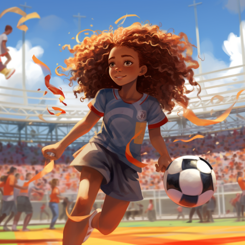 8-year-old mixed raced girl with reddish curly hair, fair skin and freckles in anime style playing soccer for USA in a soccer stadium, scoring a goal. Crowd in background –ar 16:10