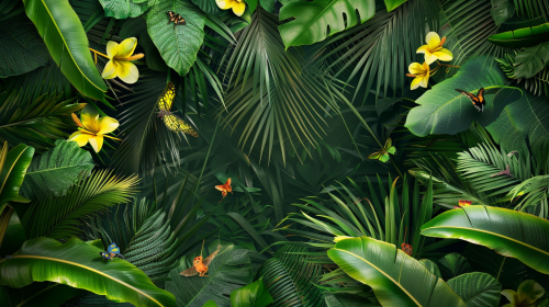 a foto of a lush jungle. you see big green banana leaves and palm leaves building a natural frame. yellow orchids and butterflies are in the jungle. there are green parrots and a hummingbird. a little red bug on one of the leaves. --ar 16:9