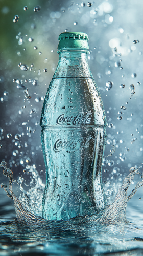 Product photography, a product shot of a pale a mint green Coca-Cola bottle on water, sparkling bubbles, sparkling water droplets splashing, soft dreamy simple backgrounds, dreamy atmospheres, close-ups, studio lighting, high resolution photography style, super detail, super realistic rendering and super sharp detail, --ar 9:16 --style raw --v 6.1 --s 250