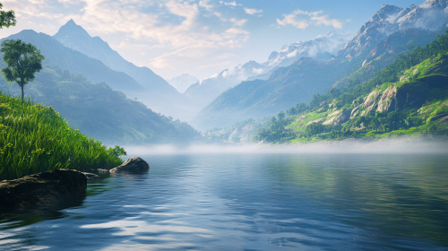 An ancient Saraswati River flows through Indian mountains with green valleys and high peaks. Mist rises over the calm water, creating a peaceful view,beautifully colored, insane detail, intricate detail, beautifully colored, Unreal Engine, Cinematic, Color,Ray Tracing Ambient Occlusion, Anti-Aliasing, FKAA, TXAA, RTX, SSAO, Shaders, OpenGL-Shaders, GLSL-Shaders, Post Processing, Post-Production vibrant colors,blue sky, --ar 16:9