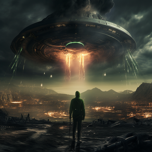 alien ufo in the sky, projecting a hyperbeam at a man, hyperrealistic, dynamic angles, glowing colors, cinematic shot, neon orange, purple, green, ray tracing --ar 16:9