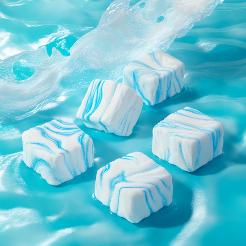 Snacks similar to plum cakes created by the FRISK brand. The snacks are mint. The FRISK logo must be present in the packaging. colors used white with blue streaks. Realistic style.