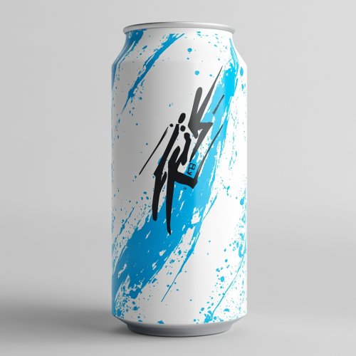 can of Energy drink designed by FRISK. the drink is mint and the color of the can is white with blue streaks. The Frisk logo must be visible. realistic style.
