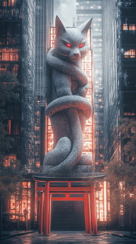 Giant, a colossal yokai-inspired stone statue of a Kitsune, standing amidst modern Japanese city buildings, its massive body entwined with glowing red torii gates, Real Engine, Super-Resolution, Ray Tracing, high resolution photography, 4k, studio photo, elegant --ar 9:16 --v 6.1