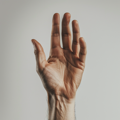 A hyper-realistic vertical image of a hand raising two fingers, with the clean white background emphasizing the sharp details of the hand. The subtle shadows create a sense of depth and realism. Crisp lighting, detailed textures, minimalist composition --ar 9:16 --v 6.0