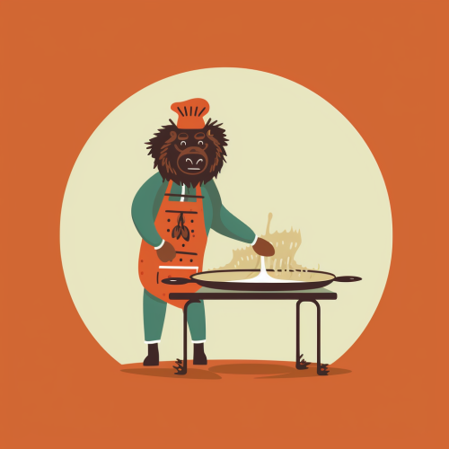 an american bison standing up on its back legs like a person, cooking at a round grill, wearing an apron and using tongs, brown fur american bison, friendly, simple vector drawing --no photo realistic parts