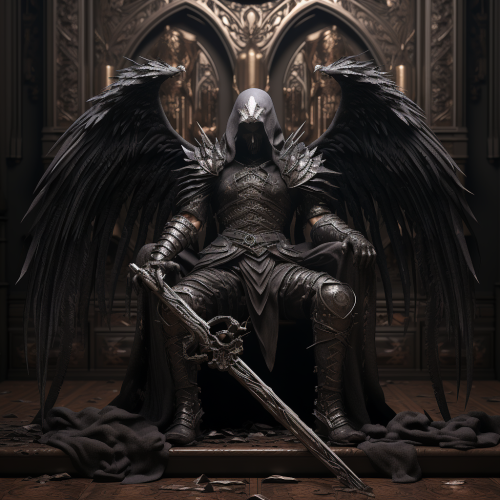 grim angel knight guard resting holding one sword, high fantasy, digital art, masterpiece painting, ultra detailed, ultra high definition, 8K resolution, 3D shading, superior quality, cover illustration, complex design, fang amulets highlights, deep rich vibrant colours, hyperrealistic, meticulously hyper detailed, artstation