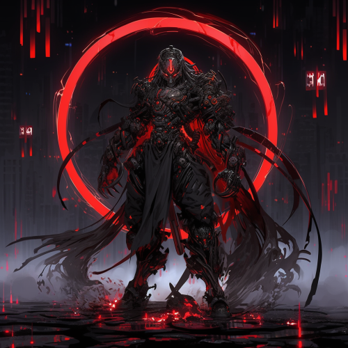 Grimdark aetherpunk ominous badass supervillain, full body, anime style, dynamic pose, high fantasy, digital art, masterpiece painting, ultra detailed, ultra high definition, 8K resolution, heavy shading, superior quality, cover illustration, complex design, luminous highlights, rich vibrant colours, hyperrealistic, meticulously hyper detailed, high contrast, artstation --niji 5