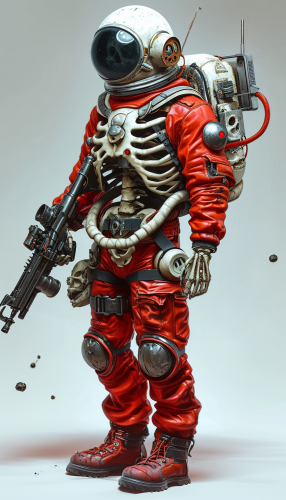 Cosmonaut wielding antimatter gun in grimdark sci-fi setting