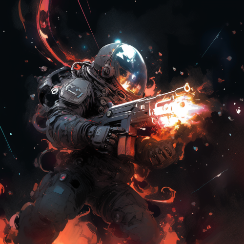 Grimdark futuristic hi-tech ominous astronaut wielding a huge antimatter gun, anime style, sci-fi, digital art, masterpiece painting, ultra detailed, ultra high definition, 8K resolution, 3D shading, superior quality, cover illustration, complex design, luminous highlights, rich vibrant colours, hyperrealistic, meticulously hyper detailed, high contrast, artstation --niji 5