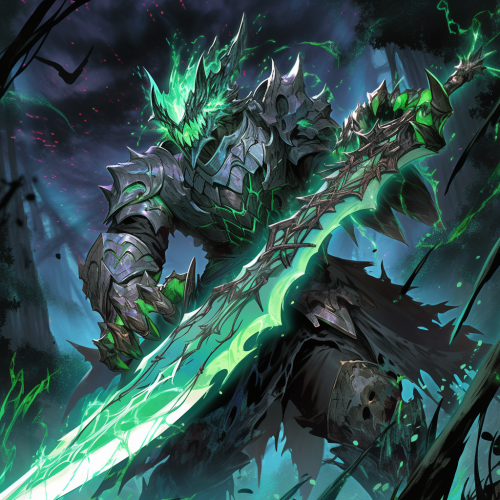 Grimdark mystic legendary omnipotent knight of seaweeds from Age of Sigmar wielding a massive vorpal blade, anime style, high fantasy, digital art, masterpiece painting, ultra detailed, ultra high definition, 8K resolution, 3D shading, superior quality, cover illustration, complex design, luminous highlights, rich vibrant colours, hyperrealistic, meticulously hyper detailed, high contrast, artstation --niji 5