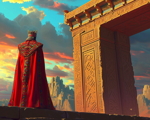 Cyrus the Great in a red royal dress at Persepolis, with Iranian motifs, cinematic lighting, and a mythical Lamassu, by Hossein Behzad, art direction, rich colors, animated feel, painterly lighting, grand scale, intricate details, epic scenery, historical fantasy, regal presence, mesmerizing visuals --v 6.0 --ar 5:4
