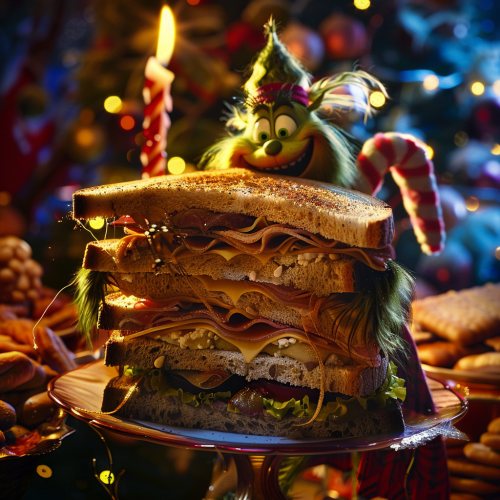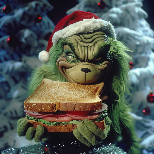 a cute grinch drinking coffee with a purple Christmas bow in his hair. Decorate the background with his sick little Christmas with a single purple ornament and one purple gift.