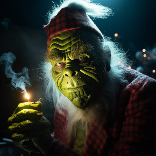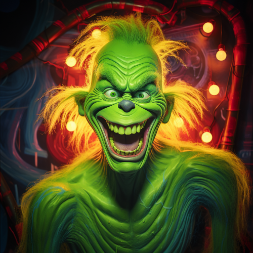 The Grinch smiling wildly in the style of neon lights, studio photography, lithograph, photo taken with provia, sharpen lens, chiaroscuro portraitures, sombre
