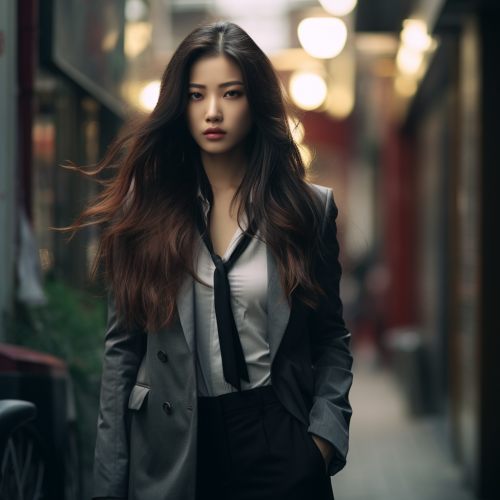 photo of a beautiful tall slim young korean female detective, long hair, wearing gloves, blazer, leggings, street photography