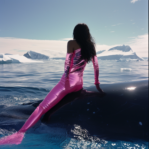 A wide angle medium shot photograph of a Malaysian-Malay supermodel wearing shiny spandex pink leggings riding a blue whale in antarctica, as seen from her back, the style of slim aarons, taken on 35mm film Leica camera, 2: 3 ASPECT RATIO, --style raw --stylize 50 --v 6.0