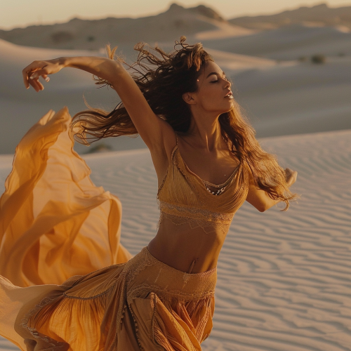 denise richards at age 20, full body photo, wildly dancing and spinning in a blur, barefoot in a light dress, hair flying, golden hour, over desert dunes. Her head is thrown back, smiling widely, not looking at the camera.