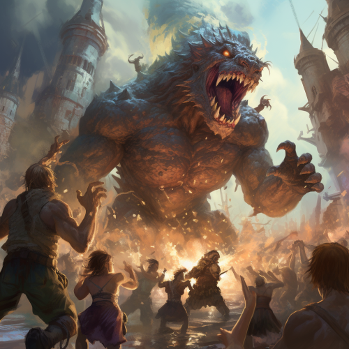 a group of five adventurers is battling a giant scorpion in a dark cave. One of the adventurers holds a torch in the background which is the only source of light. A human monk who is bald and wears maroon robes, battles the scorpion in front with a shortsword and fists. A male dwarf with brown hair and beard in armor wields a war hammer, a half elf in armor can be seen in the background with an unknown weapon, and a red-headed young human female with wavy red hair is also in the background casting a spell and a male elven archer with long can be seen firing arrows at the scorpion in the background. The focus is on the human monk who is in front of the giant scorpion with the others in the background...some are barely visible.