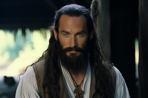 dvd screengrab, from 2002 fantasy film, "fellowship of the ring" hobbit priest, long braided beard, Pale skin, brown eyes, thick black hair in a tight bun, thick black beard and mustache in large braid, Stern brow, high cheekbones, strong jaw. wearing white and blue robe. --ar 3:2
