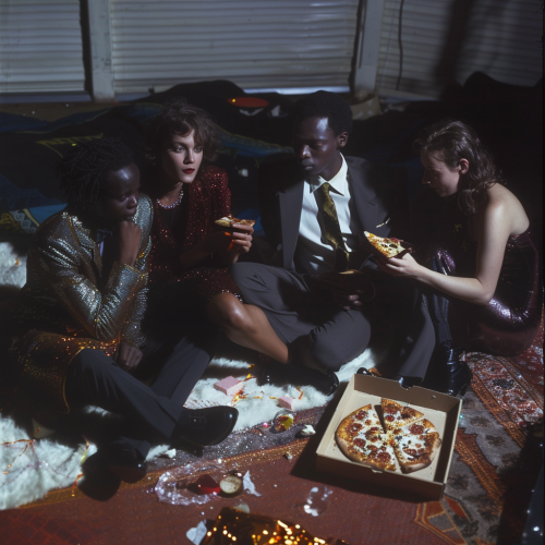 an unstaged photo shooting of a diverse group of a maximum of 4 young adults, at night, sitting on the floor, cosy with carpets laying all over the place, the adults are glamorously dressed with elegant clothing, suits and dresses, eating pizza out of the pizza box, happy, candid, grainy, imperfect look, wide angle shot with focus on the floor, flash photography, hard light --style raw --stylize 50 --v 6.0