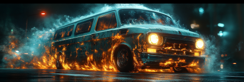 realistic, fantasy style, egyptian inspired, The spectral mystery machine van from scoobie-doo appears as a ghostly, translucent version of its real counterpart, shimmering with an ethereal glow. outlined in shades of pale blue and gray, with wisps of mist curling around its form. The headlights glow with a haunting, otherworldly light, and its movements are unnaturally fluid, as if swimming through air. --ar 3:1 --s 750 --style raw
