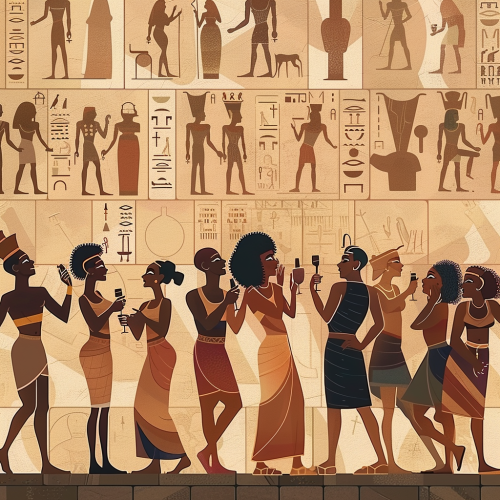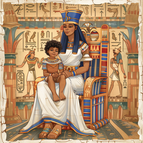 parchment style cartoon, front facing, full body, Ancient Egyptian queen Mother sitting in throne with child prince in her lap, Black African, illustration