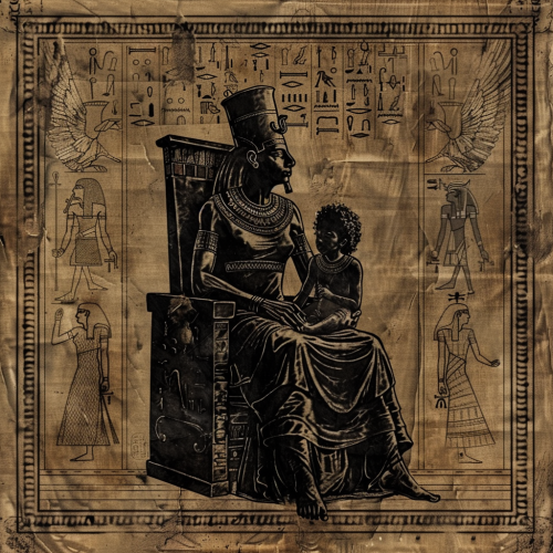 parchment style, front face, full body, dark black Ancient Egyptian queen Mother sitting in throne with child prince in her lap, Black African, illustration