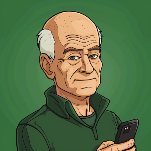 male profile picture, mid fourties, white, balding, uncool, cellphone, green background, cartoon, facing viewer