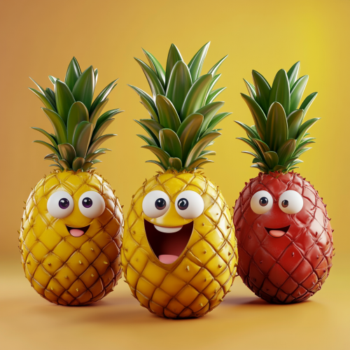 Cartoon cute pineapple characters, in the style of cartoon, cute facial expressions, 3D rendering, solid color background, high-definition details, three adorable pineapples with big eyes and smiling faces standing together. The left one is yellow, the middle red, and the right green, with a focus on character design and studio lighting. --v 6.1