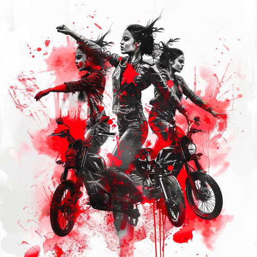 Red and black colors, A GROUP OF girl power rider arms on air, riot attitude, side view, red an black colors in the style of illustrated advertisements, multiple filter effect, samikshavad, video montages, free brushwork, grandiose, subtlety. --v 6.0