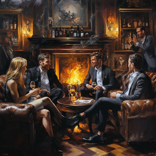 a group of smartly dressed men and women. they are sitting in a easy-going bar with leather sofas. a fire burns in a fireplace in the background. the atmosphere is comfortable, the have just finished a discussion.