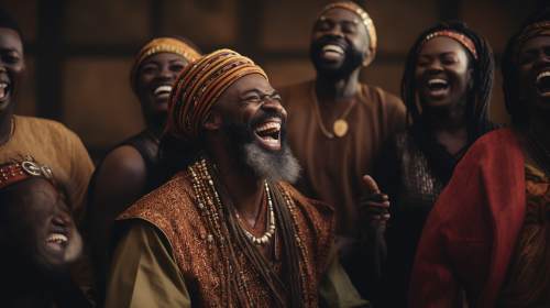 hd hyper realistic African American men with beards dressed in biblical garments laughing with African American women dressed in biblical garments modest and headwraps laughing --ar 16:9 --v 5.2