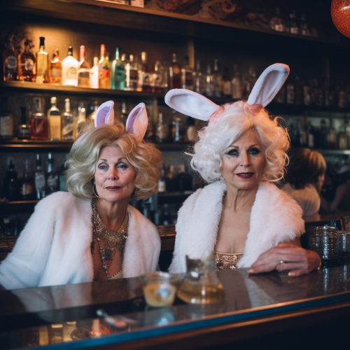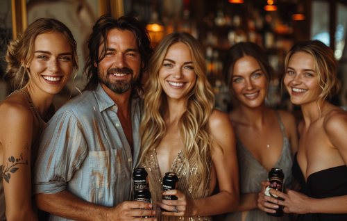 Group of smartly dressed men and women in bar.