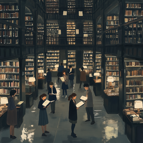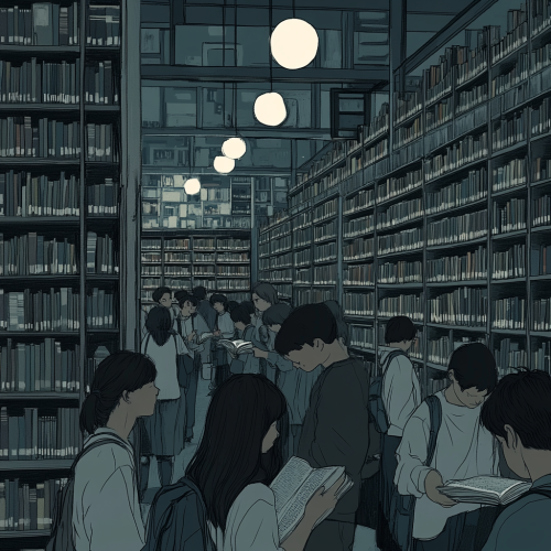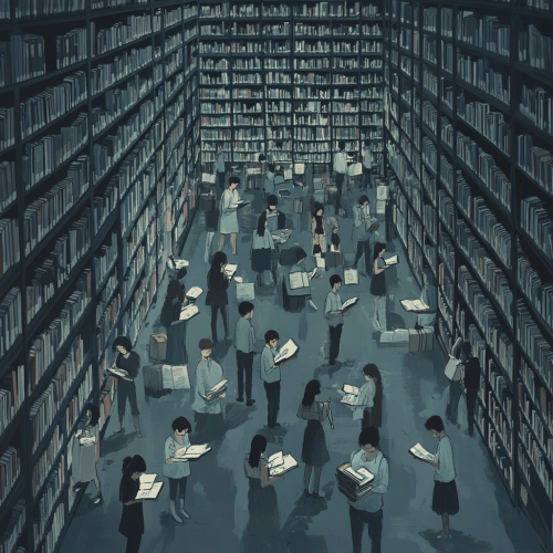 A large, dimly lit library with rows of tall bookshelves. in muted shades of grey with many students holding grey books. However, one student holds a bright red book and looks confident, other students are looking at him in shock and jealousy.