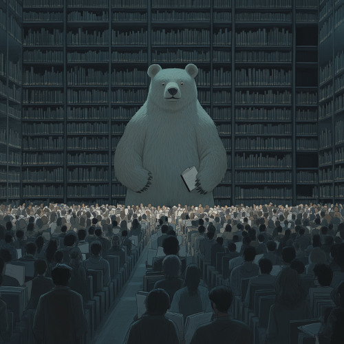 A large, dimly lit library with rows of tall grey bookshelves. Hundreds of students are scattered throughout, each holding grey books. In the center of the library stands a prominent bear, capturing everyone's attention. All the students are staring intently at the bear with expressions of shock and surprise. The bear contrasts sharply against the muted grey tones, making it the focal point of the scene.