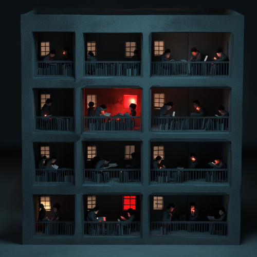 A cross-sectional, dollhouse-like view of a dimly lit dorm building, where every room is bathed in muted grey tones. Inside each room, students are struggling and frustrated, hunched over grey books in the dim light. The entire scene feels drained of color, except for one room. In this room, a single student holds a glowing red book, which radiates vibrant light, illuminating their face and surroundings. The stark contrast between the glowing red book and the dull, grey environment highlights the student's focus and energy in an otherwise bleak setting.