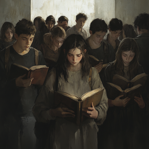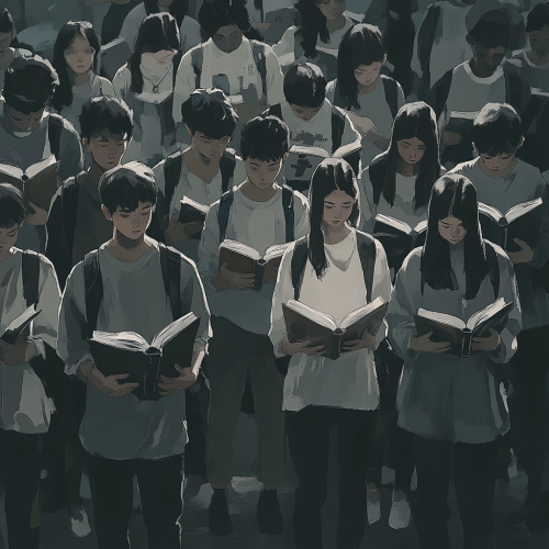 A large group of students stands in a quiet room, each holding and reading a book. The entire scene is dominated by grey tones: the students, their clothes, the books, and the room itself are all in muted shades of grey. The lighting is dim and soft, enhancing the monochromatic and subdued atmosphere. The students are expressionless and focused on their books, blending into the overall grey, colorless environment. The scene is uniform and grey, creating a somber, quiet mood.