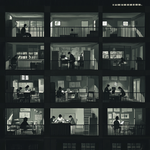 A cross-sectional, dollhouse-like view of a large, dimly lit dorm building, where every room is filled with grey tones and dim lighting. In each room, students are hunched over, struggling with grey books, their expressions showing frustration and exhaustion. The entire scene is bleak and colorless.