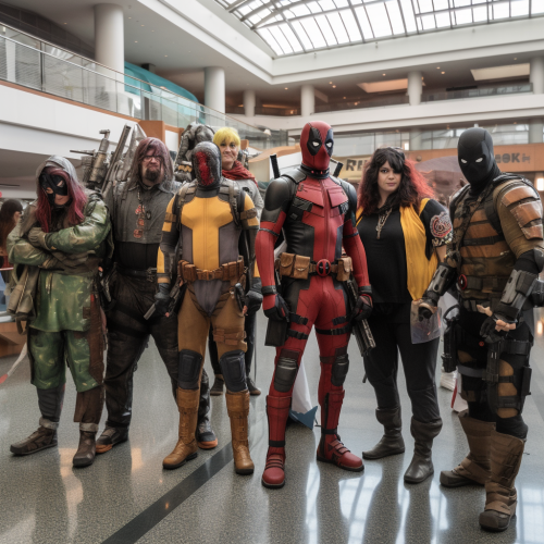 A highly realistic group photo taken indoors, featuring six people dressed in detailed, movie-quality cosplay outfits. The central figure is a person dressed as Deadpool, wearing the iconic suit from Deadpool 2, standing confidently at the center. Surrounding them are five other people dressed in various superhero costumes from different comic book universes, all with intricate, lifelike details in their costumes and facial expressions. The indoor setting is brightly lit, with the group posing in a spacious room decorated with posters of comic characters. The image captures the energy and excitement of the gathering, with everyone’s expressions and poses reflecting their character’s personality. --v 5.0