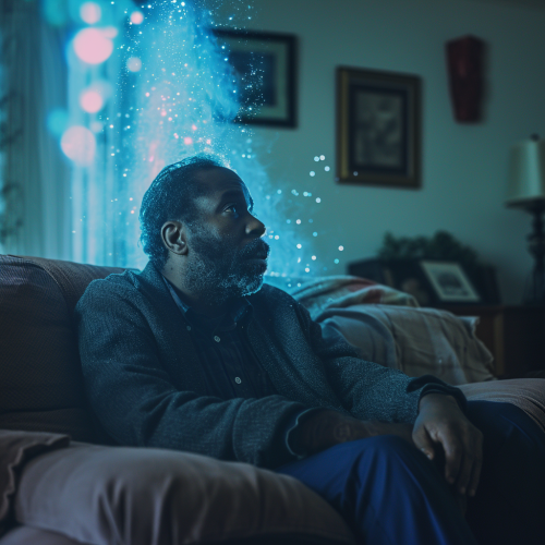 A man stands in front of a mirror, smiling in disbelief as he touches his newly grown, healthy hair. His expression is a mix of excitement and happiness. The scene is modern, with a minimalistic bathroom background, softly lit. Blue and yellow light subtly reflect off his hair, highlighting the transformation.