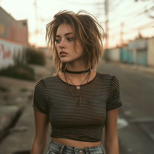 female profile picture, empty dull streets background, unfaced and uncaring expression, unamused, looking to the side, front view, medium length brown spiky messy hair, striped black and grey grunge shirt, necklace, grunge plain jeans, bottle in hand