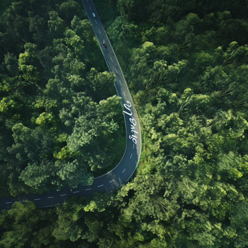 Birds Eye view of a deciduous forest with a two lane highway snaking through - the road itself in cursive spells the letters GM