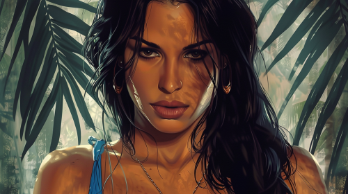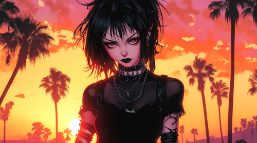 A gothic girl with wild black hair. Pale skin and black punk clothing with metal studs on. Palm trees in the background as the sun sets. Done in the anime style of Yoshiaki Kawajiri. Hip. Undead. Cool. --ar 16:9