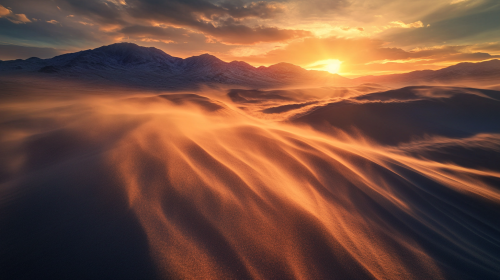 beautiful ethereal wind blowing across sand dunes at sunset, epic photo, ansel adams style, color photo, atmospheric, sunset, twilight, backlit, stunning landscape photo, wallpaper-quality photo --ar 16:9