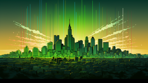 vector art of Circle badge displaying a group of humans and robots on phones reporting crime with a cityscape in the background in dark blues, bright greens, whites and oranges RGB vector art, minimalist, silhouette lighting, high contrast, icon design --ar 1:1 --v 5.2