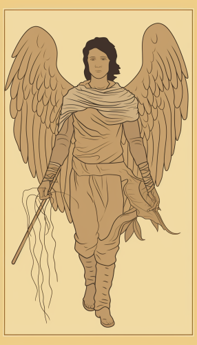 Create a highly detailed, realistic arm sleeve tattoo design featuring a powerful male guardian angel as the central figure. Depict him with strong, muscular features and large, majestic wings spread wide. His expression should be calm yet protective, with a subtle sense of strength and wisdom. He can be dressed in flowing robes or light armor, symbolizing both his divine nature and his role as a protector. One hand can be extended, offering guidance or protection, while the other holds a sword or staff as a symbol of his strength. Surround him with soft, swirling clouds and rays of light, highlighting his divine presence. Incorporate subtle ancient Greek elements like olive branches or marble ruins to add depth and symbolism to the background, while keeping the focus on the angel's commanding and serene figure.