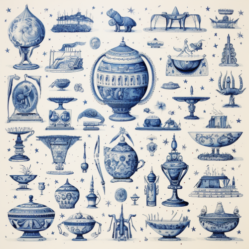 blue and white classic antiques china print including subtle images of aliens and spaceships
