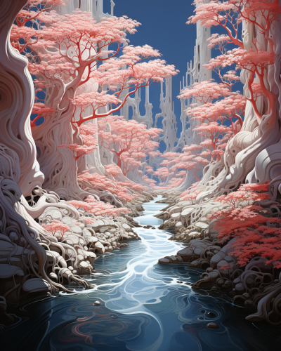 s shaped composition of a fork in the river of time dialations where a 'pastel ethereal strange and beautiful creature' from the abyss is resting on the crux of reality and all things come to a halt, pastel color pallet, art nouveau, tarot cards, James Casebere Alex Grey, Jenny Saville, zdislav beksinski, David Hockney, miyazaki, miro, dorothea tanning, blade runner, Richard Prince, Miro, Max Ernst, Mati Klarwein, Olafur Eliasson, Andy Warhol, Peter Doig, Yayoi Kusama, Cindy Sherman, photorealism, cinematic lighting, hyper realistic 8k, 4k, 4k --c 33 --s 750 --style raw --v 5.2 --ar 4:5