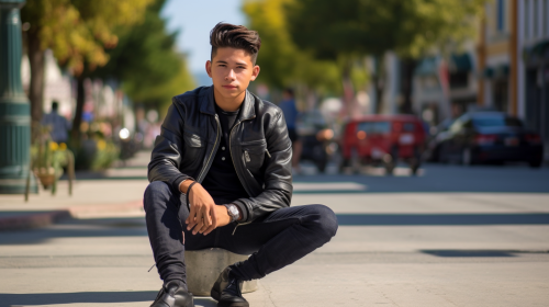 Picture of a cute 19 year old colombian boy who is 5'9" , 110lbs, with a small frame with dark brown hair and clean shaven. He has high cheek bones, earings, a wrist watch. He is wearing tight black jeans, a t shrt, and a jacket. He is sitting in a town square on a sunny day. He is smiling and looking in the distance. Picture is taken on a Canon EOS R5 F1. 2 ISO100 35MM --v 5.1 --style raw --ar 16:9