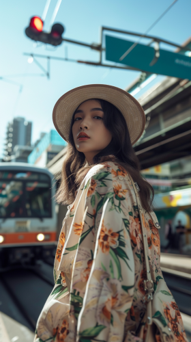 A cool Asian woman standing at a road intersection. Behind the A cool Asian woman, an sky train was passing by. It's a side view of the sky train. Fashion film. Gucci photography. luxury. Gucci mood and tone fashion photoshoot. The scene should be rendered in a cinematic. volumetric light. --ar 9:16 --v 6.0 --style raw